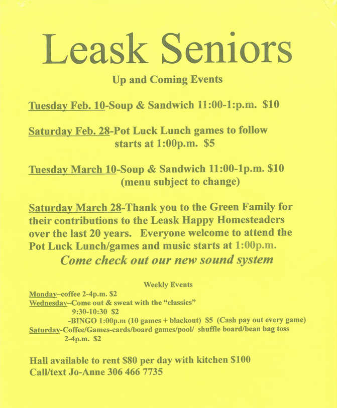 Leask Seniors Up and Coming Event Posted on Posted on19 January 202619 January 2026By Village of Leask-Admin