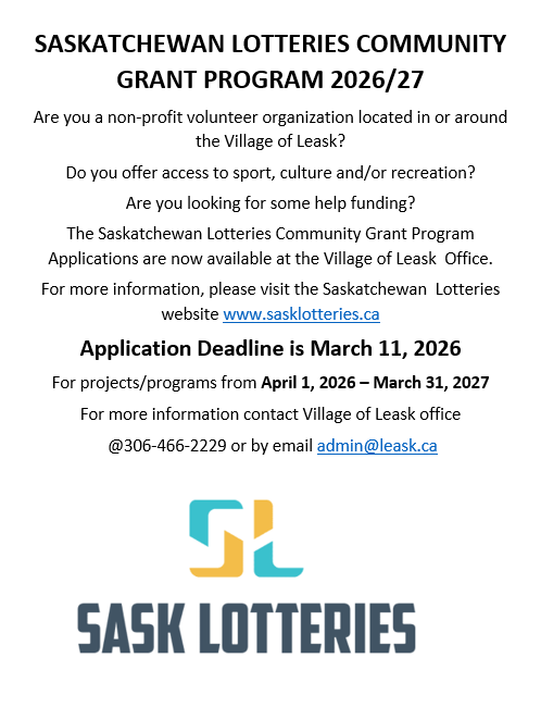 Saskatchewan Lotteries Community Grant Program 2026/27 Posted on Posted on27 January 202627 January 2026By Village of Leask-Admin
